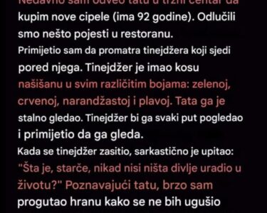 Jednog petka, moj muž se razbolio, pa sam ja sina odvela kod dadilje. Kada je moj sin izašao iz auta, izgledao je zbunjeno i čekao me. Kada sam ga pitala zašto ne ide unutra, rekao je: “Tata uvijek ide sa mnom. I ostaje kod dadilje neko vrijeme dok ja igram sam u igraonici.”