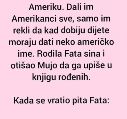 Otišli Fata i Mujo u Ameriku. Dali im Amerikanci sve, samo im rekli da kad dobiju dete moraju dati neko…