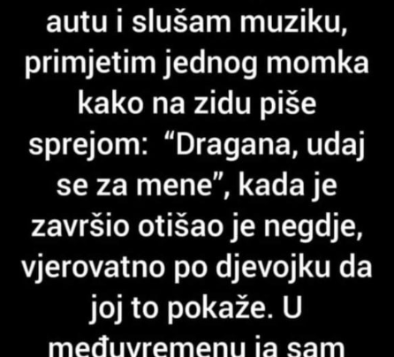 Prije neki dan, sjedim u autu i slušam muziku, primjetim jednog momka kako na zidu piše sprejom: “Dragana, udaj se…