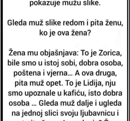 Vratila se žena sa mora i pokazuje mužu slike. Gleda muž slike redom i pita ženu, ko je ova žena?…