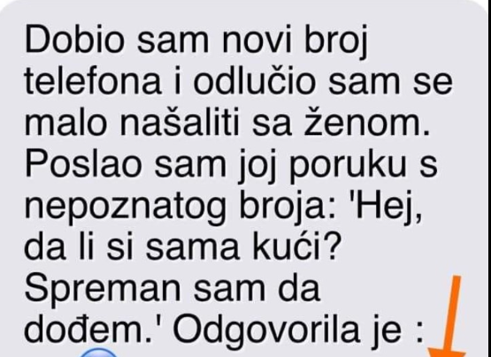 Dobio sam novi broj telefona i odlučio sam se malo našaliti sa ženom. Poslao sam joj poruku s nepoznatog broja:…