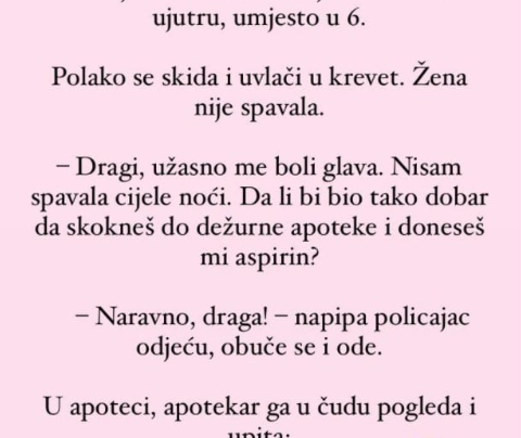 Policajac se iz noćne smjene vraća u 2 ujutru, umjesto u 6. Polako se skida i uvlači u krevet. Žena…
