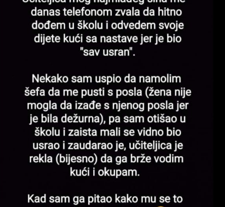 Učiteljica mog najmlađeg sina me je danas telefonom zvala da hitno dođem u školu i odvedem svoje dijete kući sa…