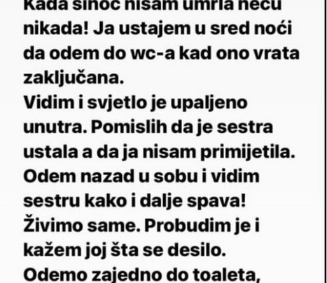 “Kada sinoć nisam umrla neću nikada! Ja ustajem u sred noći da odem do wc-a kad ono vrata zaključana. Vidim…
