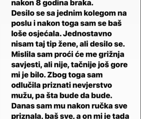 Jučer sam prevarila muža nakon 8 godina braka. Desilo se sa jednim kolegom na poslu i nakon toga sam se…