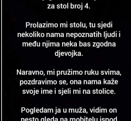 “Otišla sa mužem na svadbu, ženio se neki njegov rođak. Smjeste nas za stol broj 4. Prolazimo mi stolu, tu…