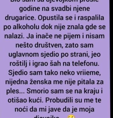 Bio sam sa djevojkom prošle godine na svadbi njene drugarice. Opustila se i raspalila po alkoholu dok nije znala gde…