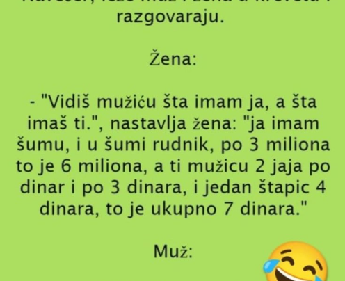 Navečer, leže muž i žena u krevetu i razgovaraju. Žena: – “Vidiš mužiću šta imam ja, a šta imaš ti.”,…