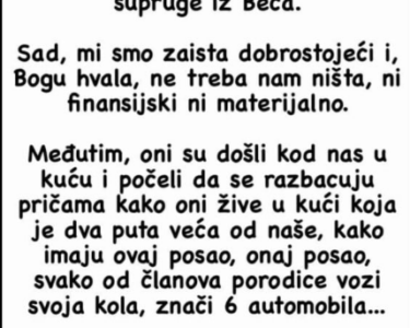 Žena ga je prekinula uzrujano: “Molim te svrati u neki luksuzniji restoran i donesi im najbolju hranu, jer kod kuće nema ništa što bih im mogla ponuditi.” Suprug je odgovorio opušteno: “Ja sam sad veoma daleko od kuće, to su tvoji roditelji a ne “stranci”, možeš im ponuditi ono što si mislila mojim roditeljima dati za ručak.”